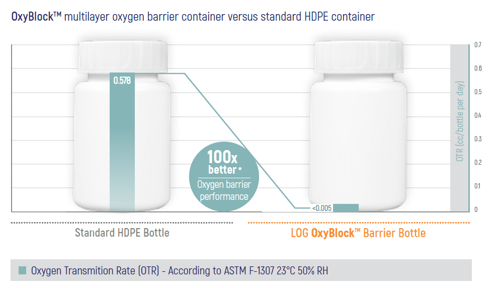 Tests haben gezeigt, dass OxyBlock® eine 100-mal bessere Sauerstoffbarriereleistung im Vergleich zu Standard-HDPE-Behältern bietet.